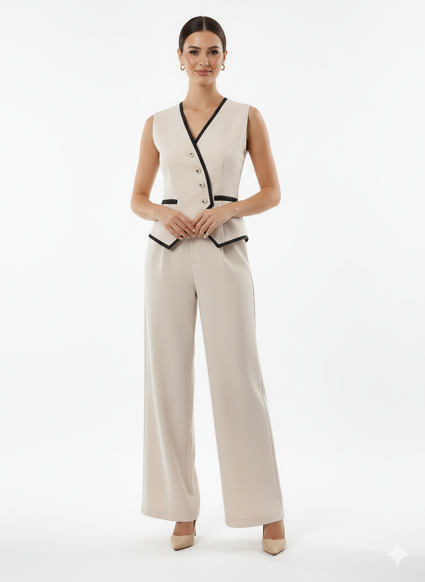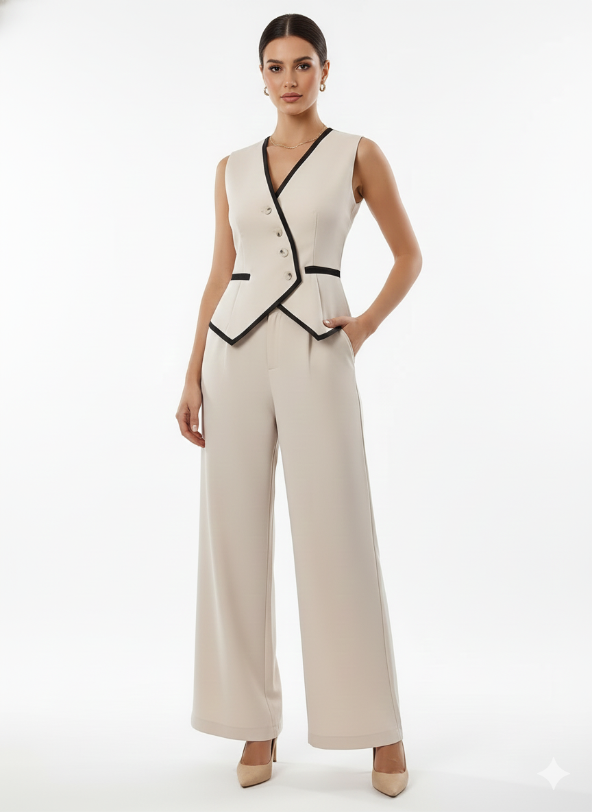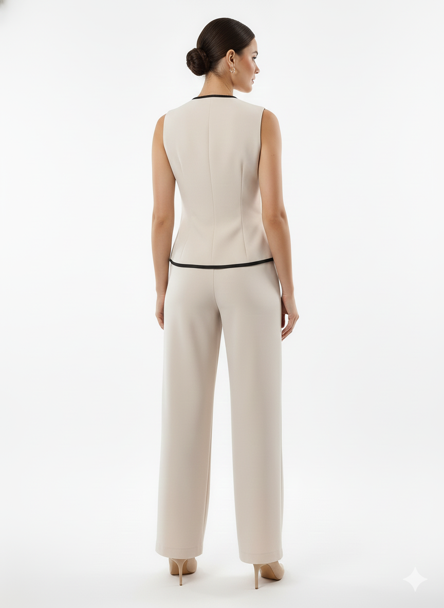 The sleeveless vest offers a refined, contemporary edge, while the high-waisted trousers provide a tailored fit that transitions seamlessly from professional settings to stylish casual outings. Aurora embodies versatility, allowing the pieces to be worn together for a coordinated statement or separately for endless styling possibilities.