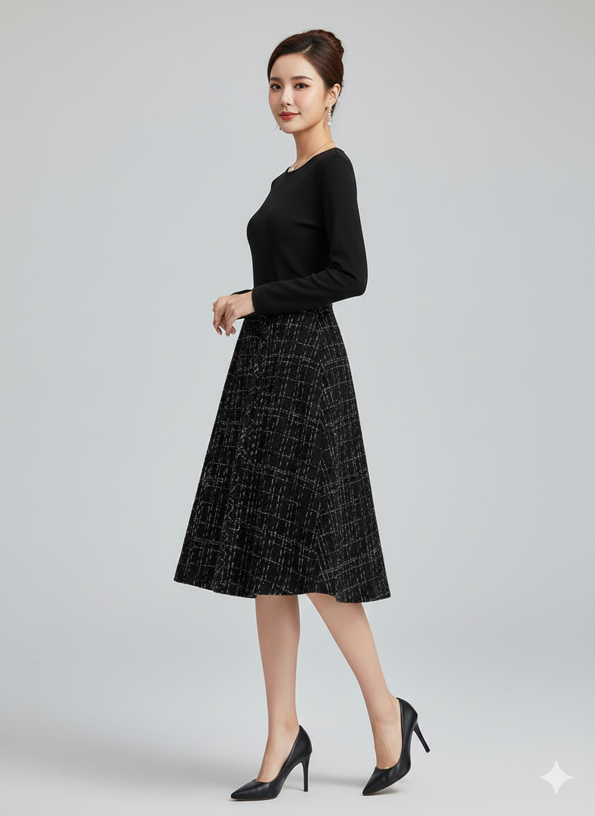 Timeless texture meets everyday elegance in the Rosalie Tweed Midi Skirt. Designed in classic black tweed, this A-line midi skirt offers a flattering silhouette that balances structure with comfort—perfect for commuting during the autumn and winter seasons.
