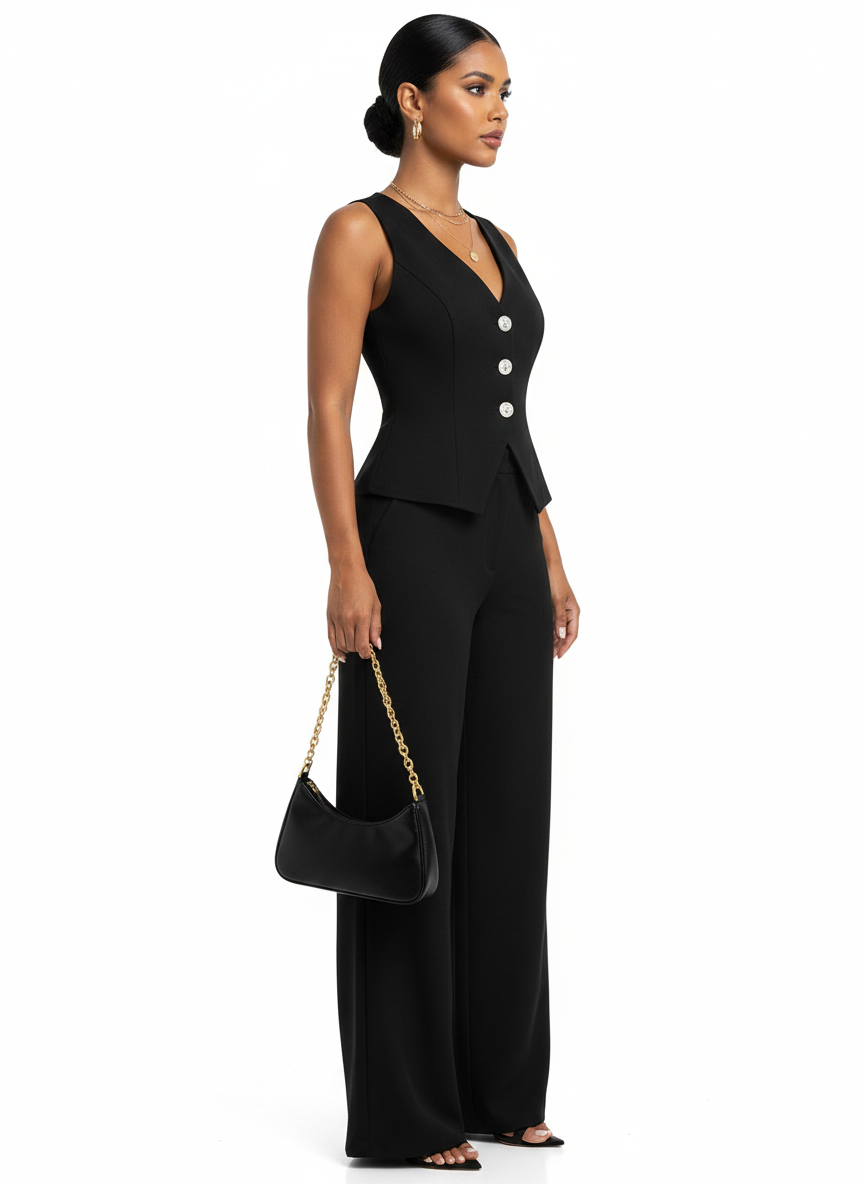Effortlessly chic and endlessly versatile, the Vela Wide-Leg Set combines modern tailoring with timeless elegance. This sleeveless blouse and wide-leg pants ensemble is designed to flatter the figure while offering comfort and freedom of movement, making it ideal for the office, casual outings, or formal events.